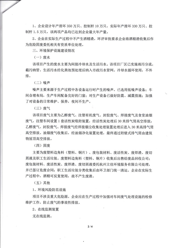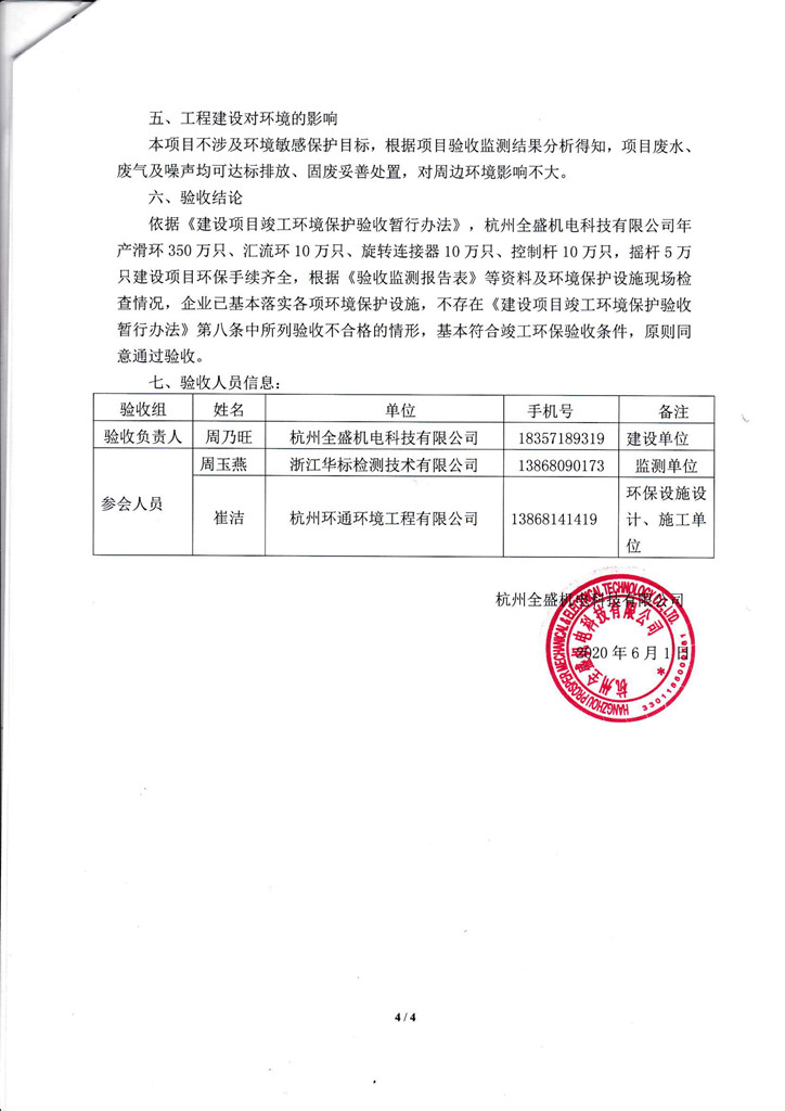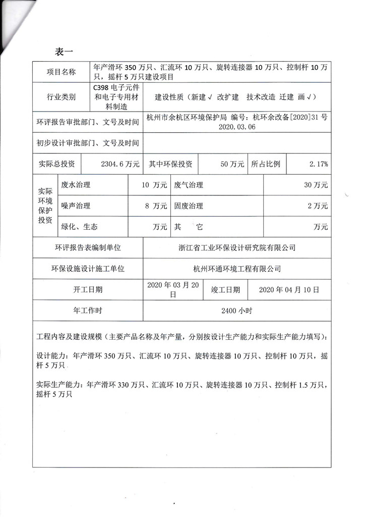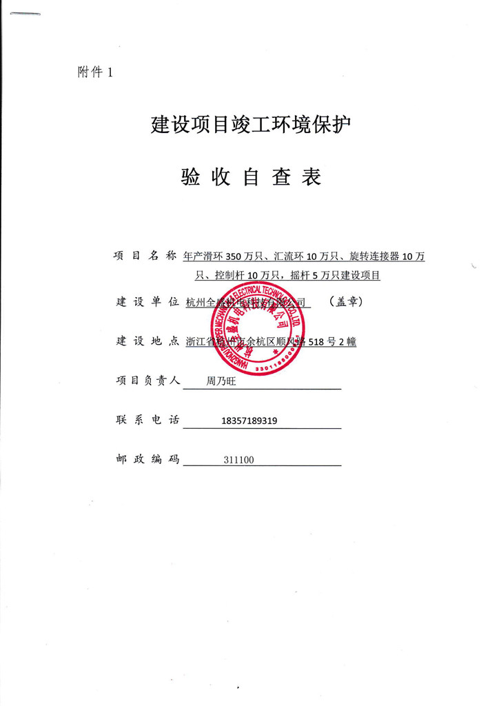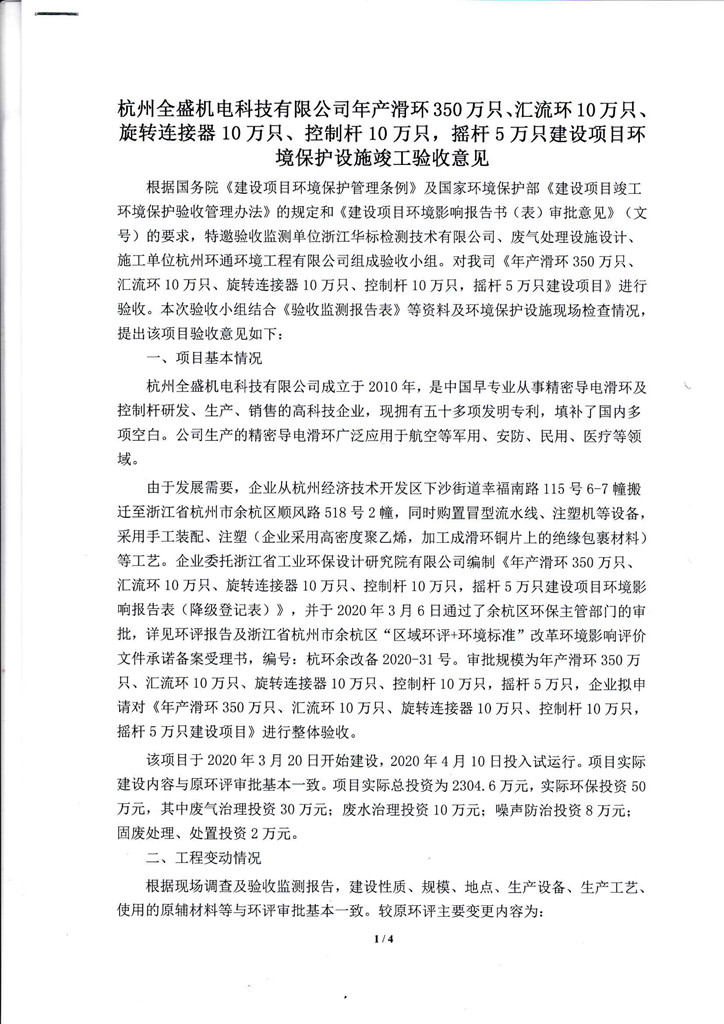 項(xiàng)目名稱:杭州全盛機(jī)電科技有限公司年產(chǎn)滑環(huán)350萬(wàn)只、匯流環(huán)10萬(wàn)只、旋轉(zhuǎn)連接器10萬(wàn)只、控制桿10萬(wàn)只,搖桿5萬(wàn)只建設(shè)項(xiàng)目環(huán)境保護(hù)設(shè)施竣工驗(yàn)收