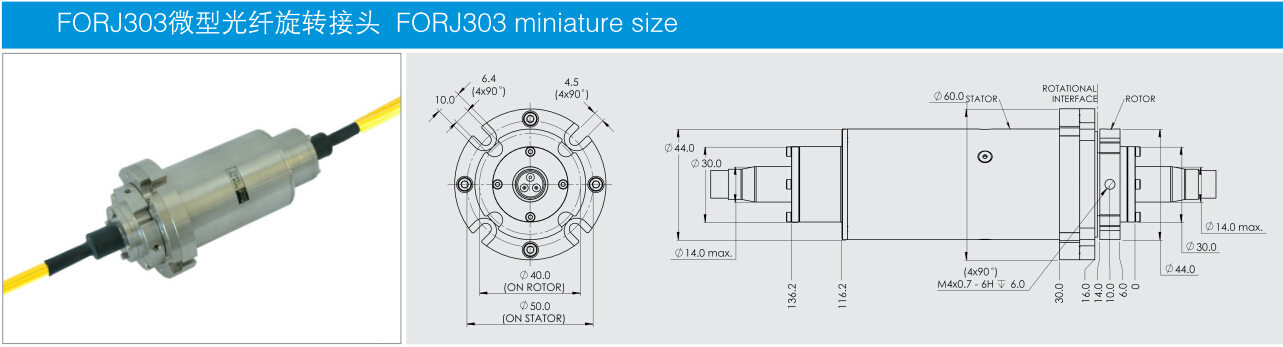 FORJ303光纖旋轉(zhuǎn)接頭用于單模或多模系統(tǒng)的光電旋轉(zhuǎn)連接;完全的雙向旋轉(zhuǎn);與現(xiàn)有的電氣滑環(huán)設計相融合;全封閉結(jié)構(gòu);能為客戶量身定制所需要的光纖滑環(huán)