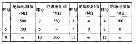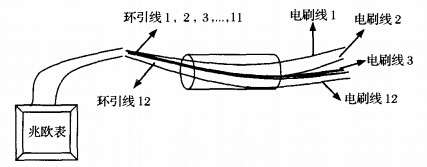 絕緣電阻檢測(cè)絕緣電阻是指在一定的電壓下各環(huán)路之間的絕緣電阻??捎?00V或250V兆歐表檢測(cè)。圖3為絕緣電阻檢測(cè)示意圖,將被測(cè)12路滑環(huán)的電刷線隔離放置,環(huán)引線(被測(cè)環(huán)路引線除外)并聯(lián)焊接一處。其中被測(cè)環(huán)路的環(huán)引線為一檢測(cè)端,其余并聯(lián)的環(huán)引線為另一檢測(cè)端,用500V或250V兆歐表測(cè)得當(dāng)前電阻值。